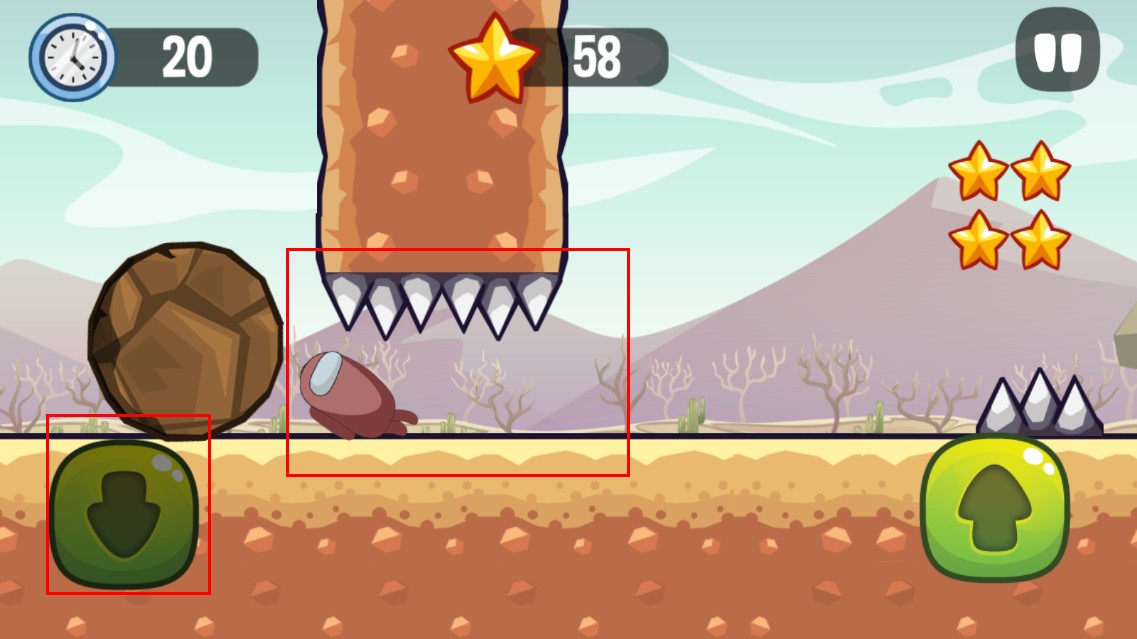 3、當上方有帶尖刺的危險物體落下時,點擊左側向下箭頭按鈕,能讓角色下蹲,躲避危險,保障安全。