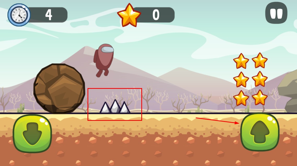 2、遇到尖刺等障礙時,點擊右側向上箭頭按鈕,可讓角色跳躍,避開障礙,繼續前行。