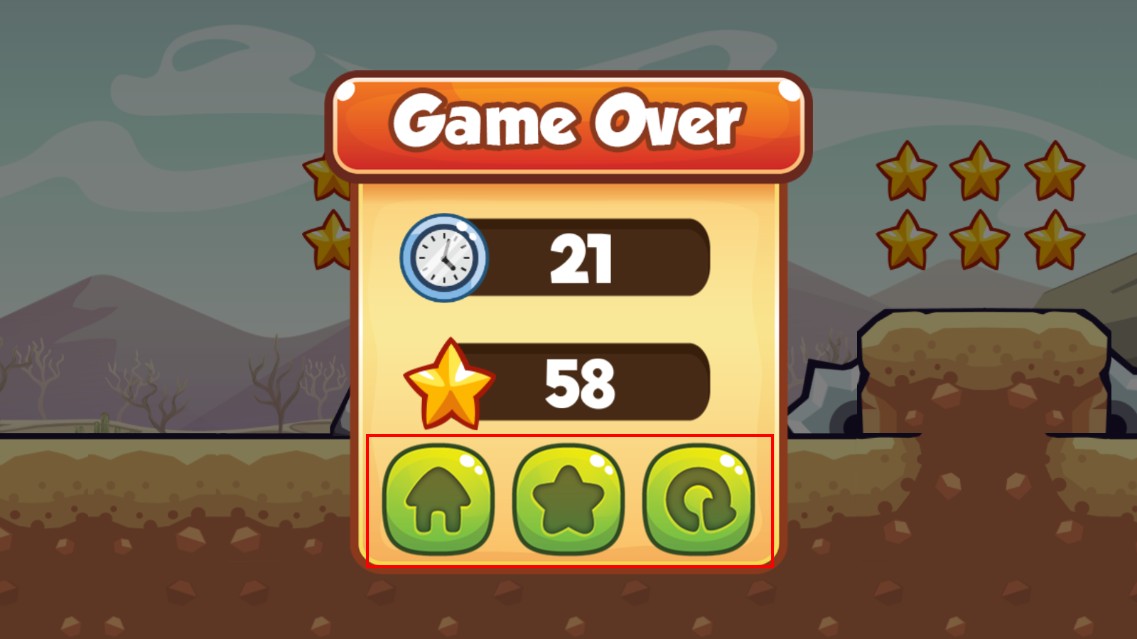 4、游戲結束后,會顯示Game Over界面,可看到游戲時長和收集星星數量,點擊對應按鈕,可選擇返回主頁、查看星星或重新開始游戲。
