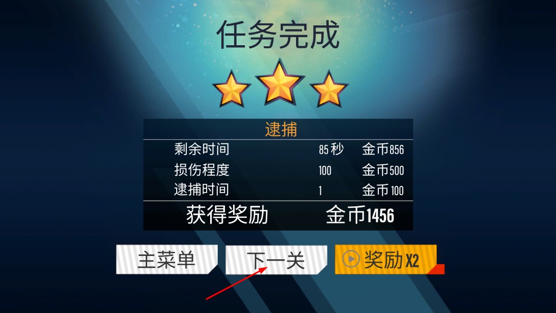 4、成功完成逮捕任務后,會顯示任務完成,可看到剩余時間、損傷程度、逮捕時間等任務相關數據,以及獲得的金幣獎勵,點擊下一關可繼續挑戰后續關卡。