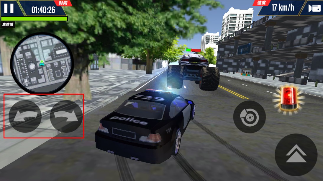 3、通過點擊左側左右箭頭按鈕,能控制警車左右轉向,在街道上靈活變道,調整行駛路線,更好地追擊目標。