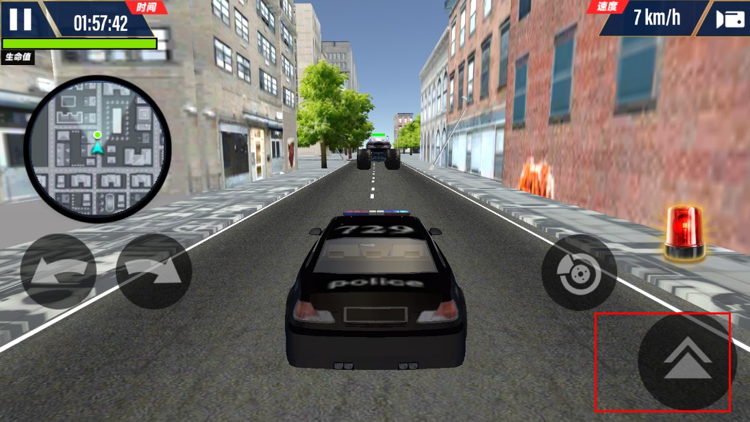 2、駕駛時,點擊右側前進按鈕,可操控警車在城市街道上行駛,追擊目標車輛。