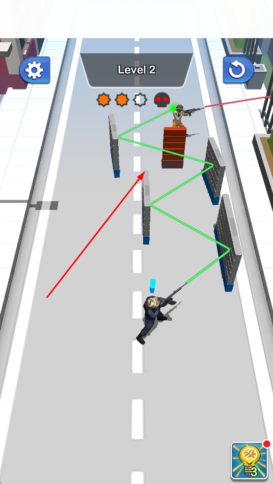 4、若敵人處于復雜障礙物后,規劃綠色激光的反射路徑,利用場景里的墻壁等進行激光反射,精準命中敵人,完成關卡。