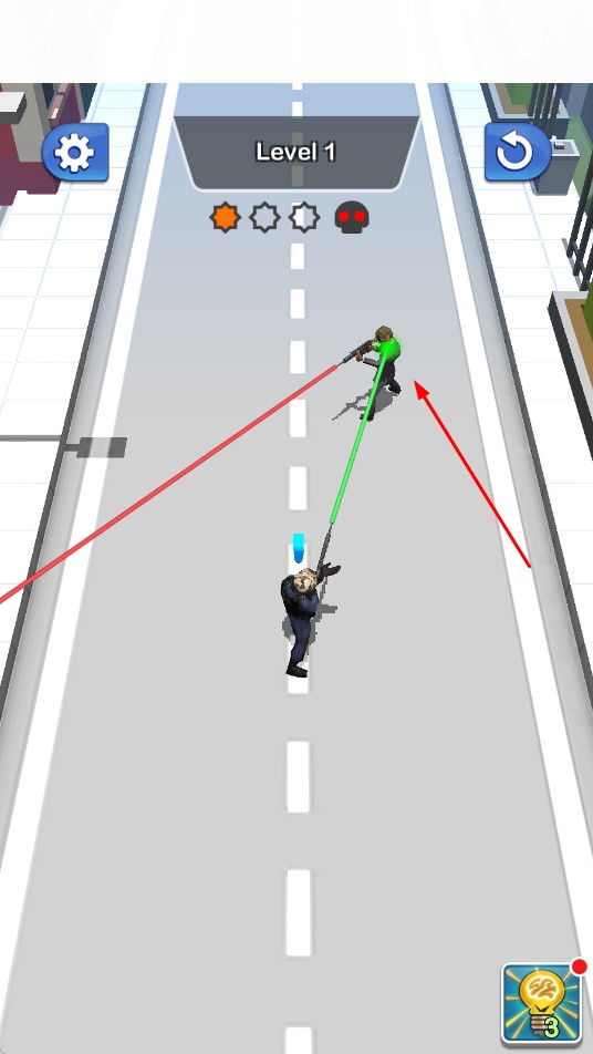 1、進入Level1,操控角色移動,利用綠色激光瞄準敵人,同時躲避敵人紅色激光,精準射擊消滅對手,推進關卡進程。