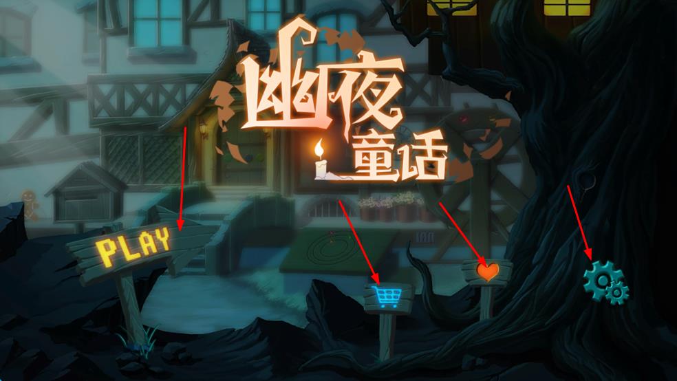 1、點擊PLAY進入幽夜童話,界面中商店可購道具,愛心或關聯進度,齒輪設置調整,快速開啟冒險。