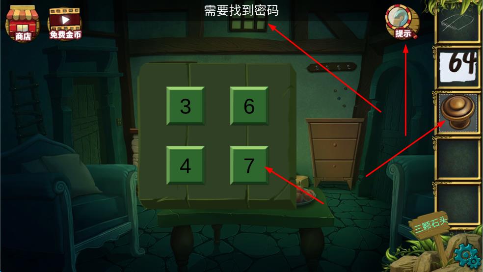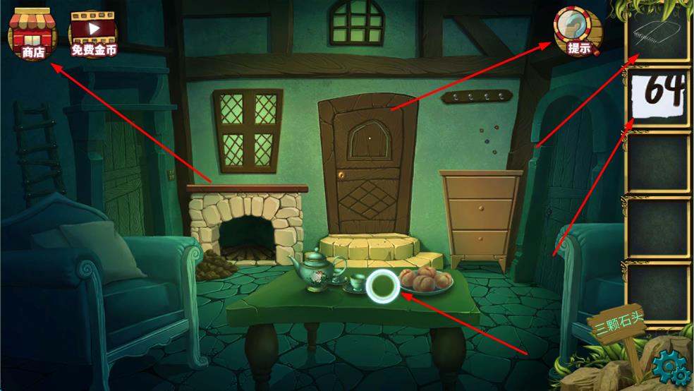 2、探索室內場景,收集桌上互動物品,利用左上角商店、免費金幣功能,借助提示按鈕找解謎線索。