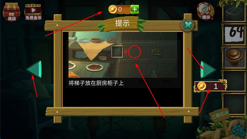 4、當解謎卡殼時,消耗金幣查看提示,按指引將道具放廚房柜子,合理規劃金幣使用,推進游戲進程。