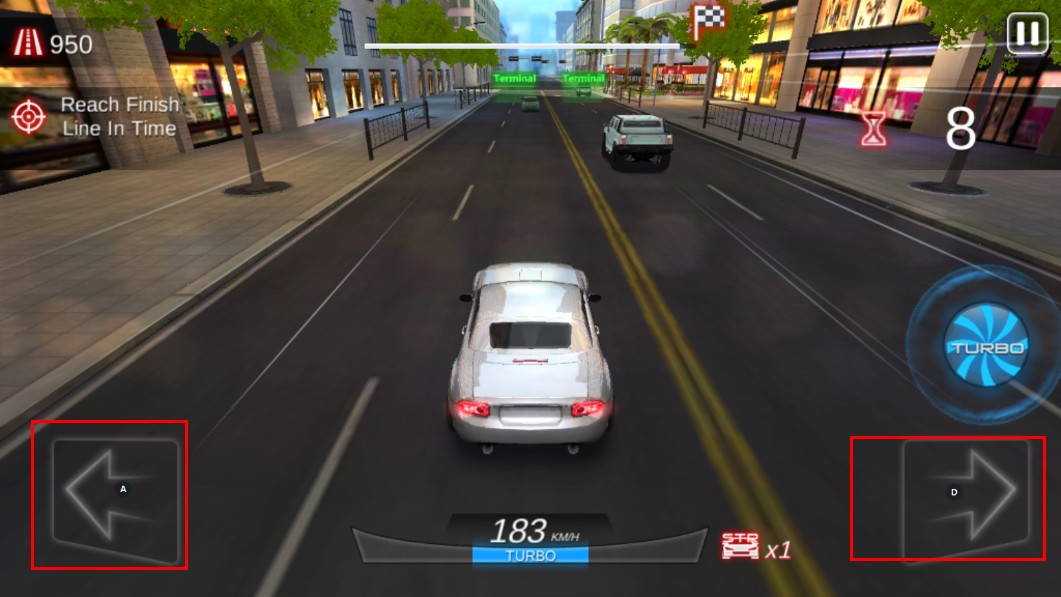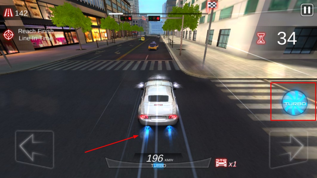 2、在城市道路競速時,點擊右側TURBO按鈕,能觸發車輛渦輪加速效果,讓車速瞬間提升,更快向終點沖刺。