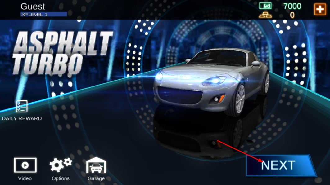 1、進入游戲會看到帶有跑車的啟動界面,點擊右下角NEXT按鈕,可進入賽事選擇或車輛準備環節,開啟競速之旅。