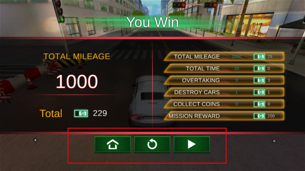 4、成功抵達終點后會出現You Win的勝利界面,顯示行駛里程、用時等數據,此時可點擊下方按鈕選擇返回主頁、重新比賽或開啟下一場競速。