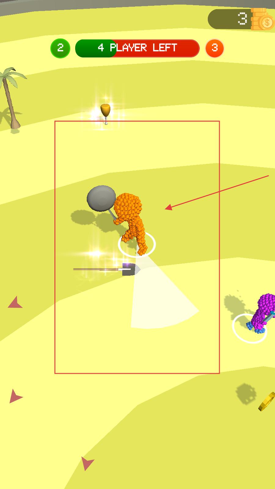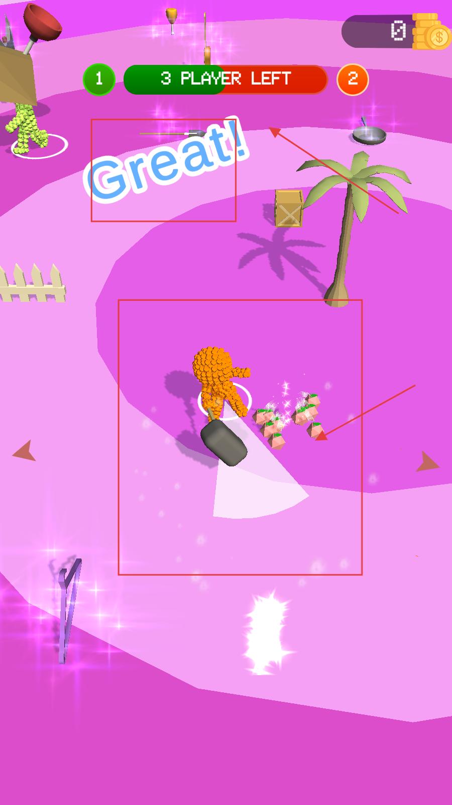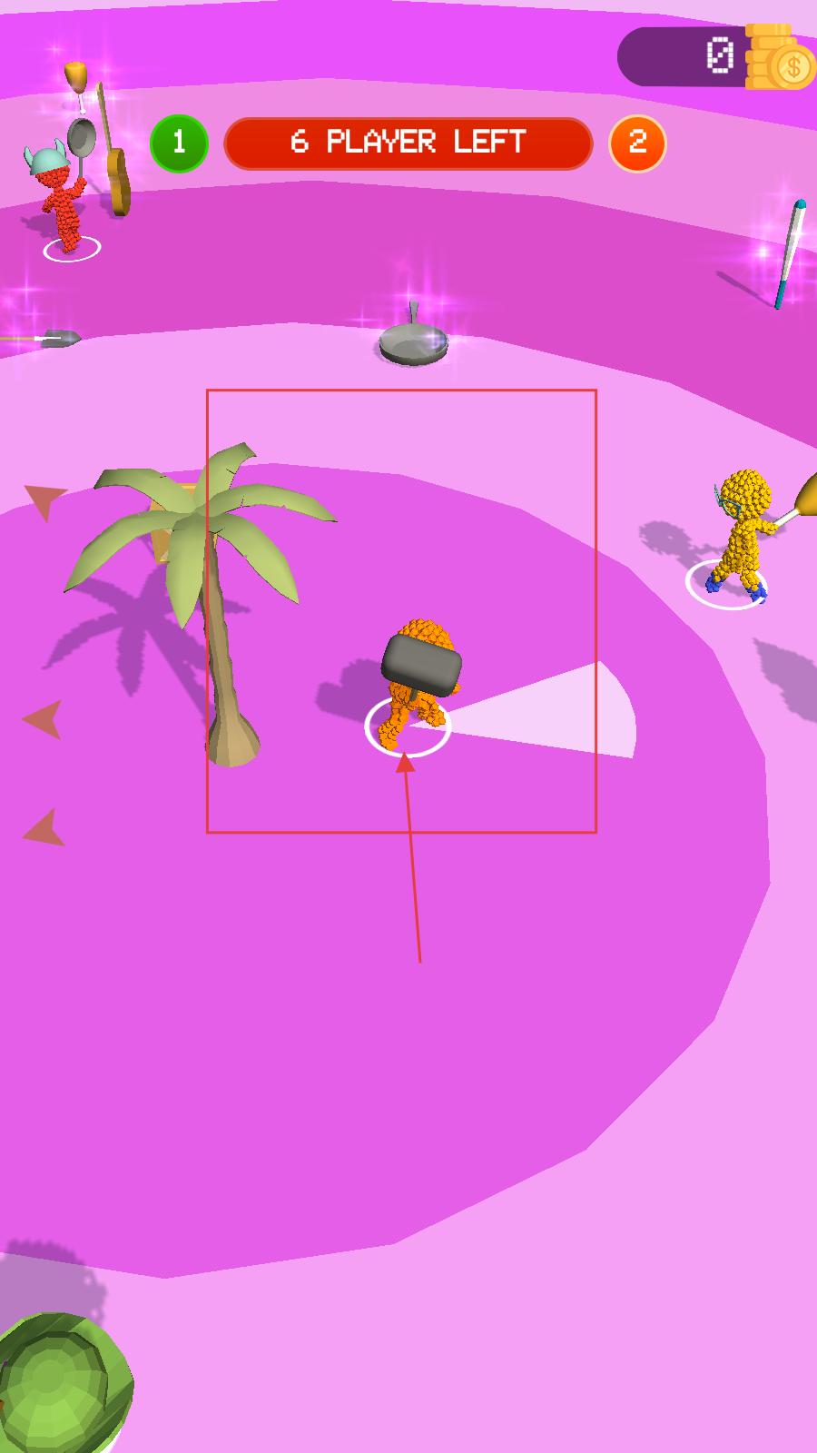 2、玩家需要移動橙色小人,利用手中的道具與其他小人互動,擊敗對手,同時注意剩余玩家數量。