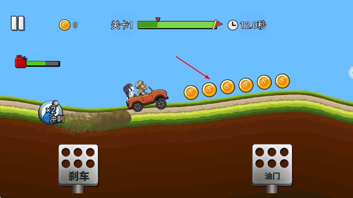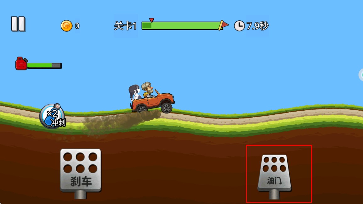 2、在賽道行駛時,點擊右側油門按鈕,可控制車輛加速,根據地形情況,合理使用油門,讓車輛順利爬坡前行。