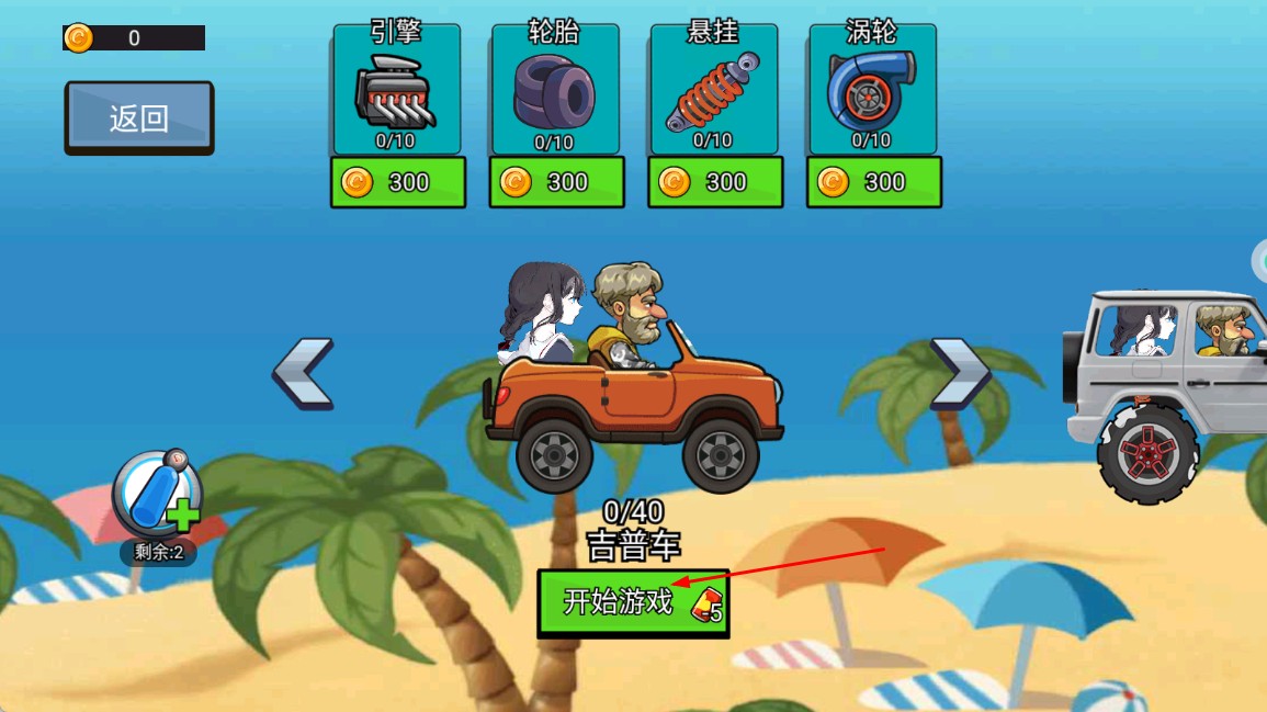1、進入游戲會看到車輛選擇界面,有吉普車等車輛可選,點擊開始游戲按鈕,即可進入關卡1的賽道,開啟登山賽車挑戰。