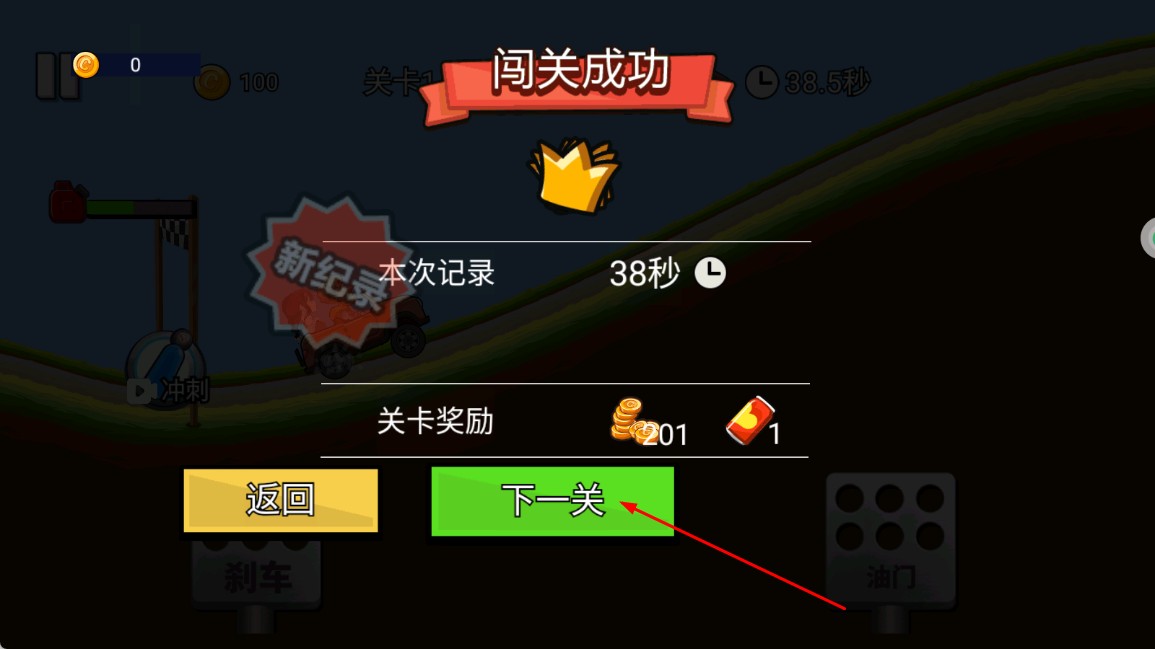 4、成功完成關卡1后會出現闖關成功界面,顯示本次記錄時間和關卡獎勵,此時點擊下一關按鈕,可進入下一個賽道,繼續登山賽車挑戰。