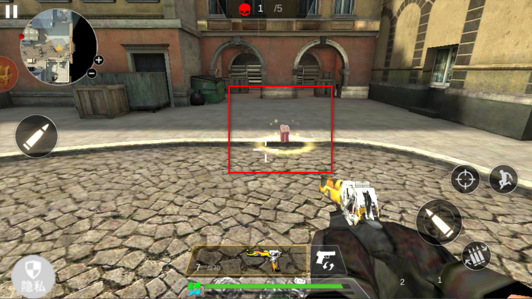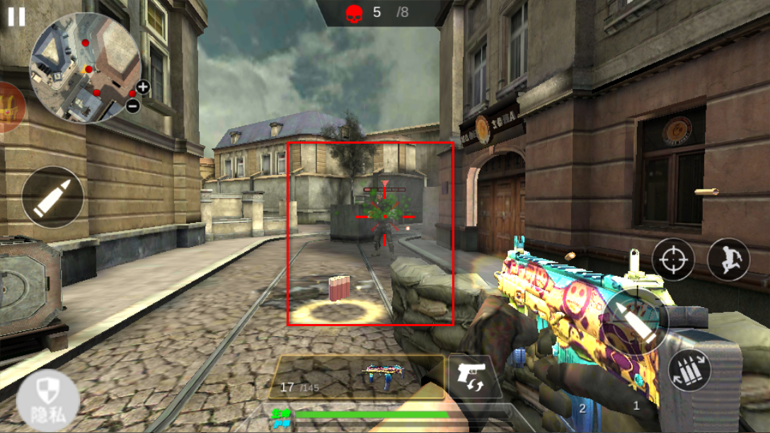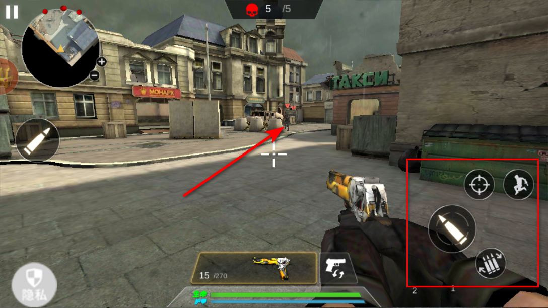 1、進入游戲,操控角色在街頭場景移動,利用右側射擊、奔跑等按鈕,瞄準敵人發起攻擊,同時注意躲避敵人的反擊。