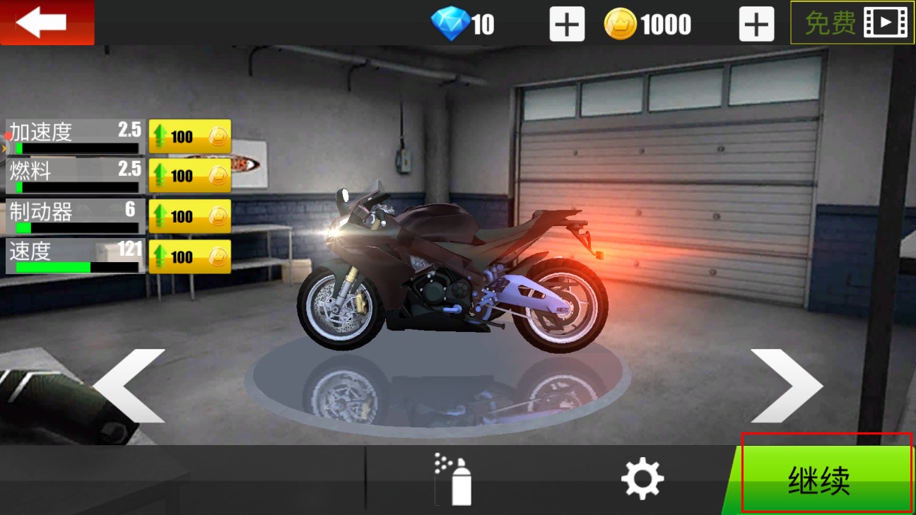 2、在車庫界面,可查看摩托的加速度、燃料、制動器、速度等屬性,點擊繼續按鈕,進入競速準備環節。