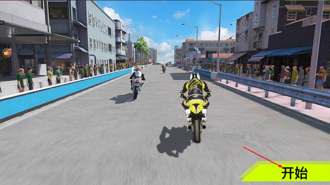 1、進入游戲界面,點擊右下角開始按鈕,就能駕駛摩托在城市道路上開啟競速挑戰,感受速度與激情。