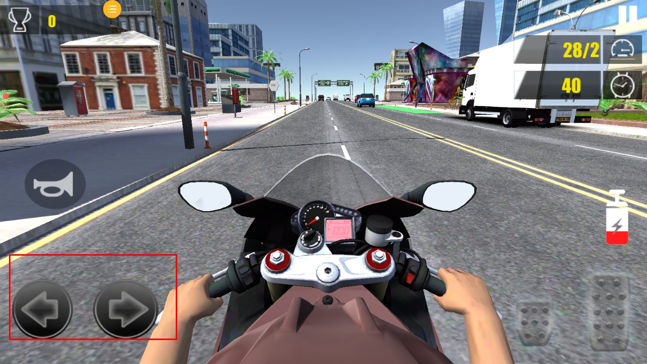 4、在城市道路行駛時,可使用左側箭頭按鈕控制摩托轉向,靈活躲避車輛等障礙,順利完成競速挑戰。