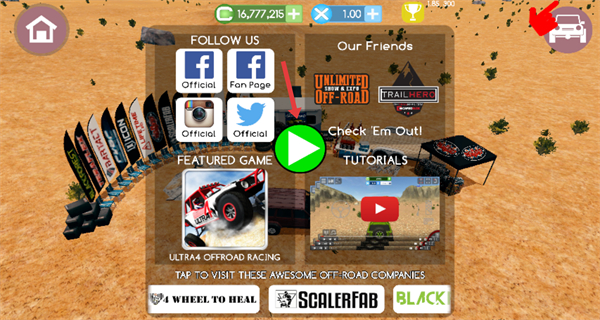1、游戲初始界面有社交平臺入口,還有推薦游戲和教程,點擊綠色播放按鈕,可進入游戲主界面。