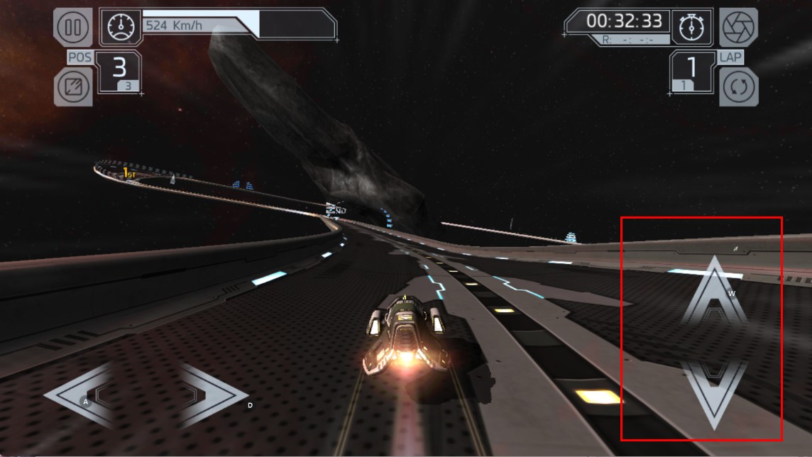 2、在競速場景,點擊右側上下箭頭按鈕,可控制飛船加速前進與剎車減速,在星際賽道上飛馳。