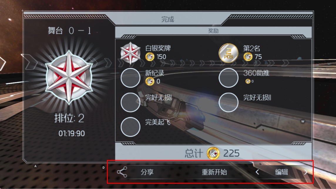 4、完成競速關卡后,會出現包含排位、獎勵等信息的結算界面,可選擇分享、重新開始或編輯等操作,開啟后續流程。