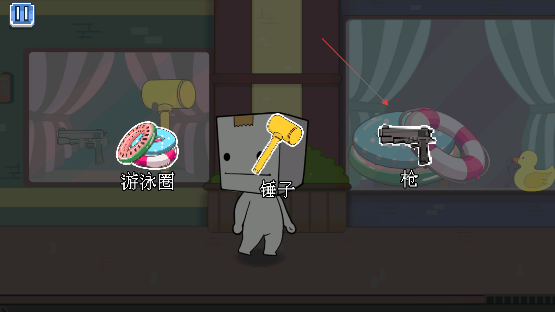 4、面對游泳圈、錘子、槍的選擇,根據當前處境,若需對抗危險,可選擇槍,利用槍械的攻擊能力應對威脅。