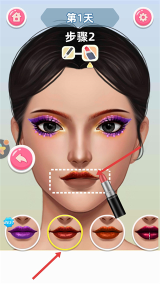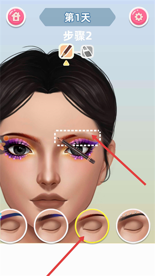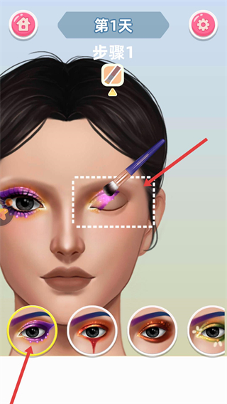 1、根據提示用工具為人物眼部上妝,下方有多種眼妝樣式可選,能打造出不同的眼部美妝效果。