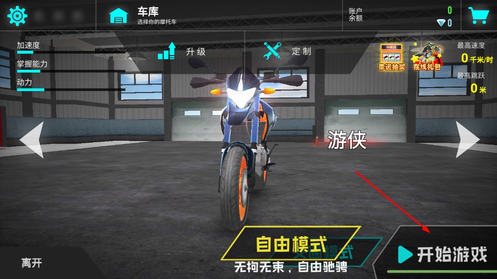 1、進入車庫界面,能看到游俠摩托車,還可對其進行升級、定制,調整加速度、掌握能力、動力等屬性,之后點擊開始游戲,開啟摩托駕駛。