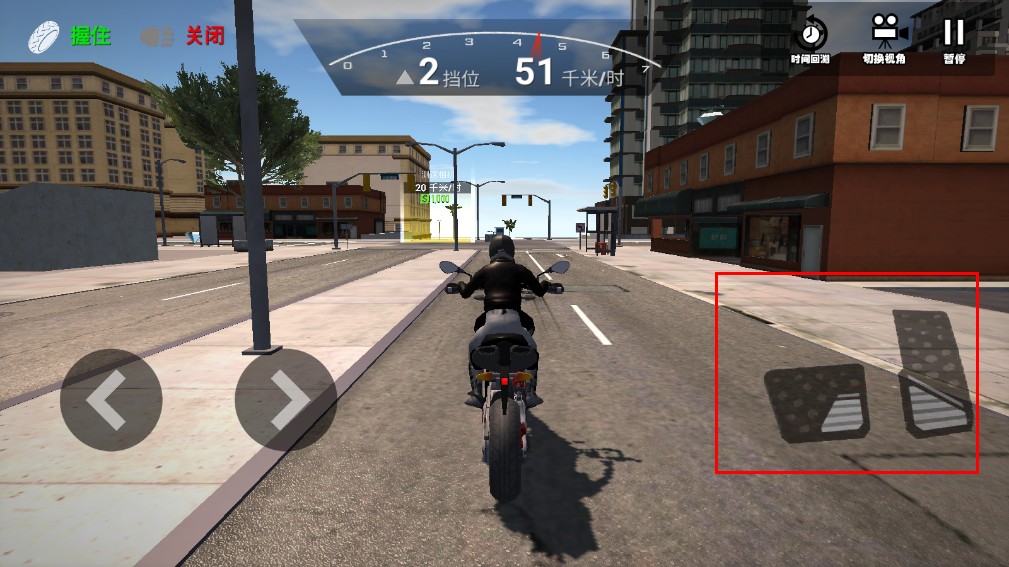 2、在城市道路駕駛時,右側的操作按鍵可控制摩托車加速、減速等,同時上方儀表盤會顯示擋位、速度等信息,輔助駕駛。