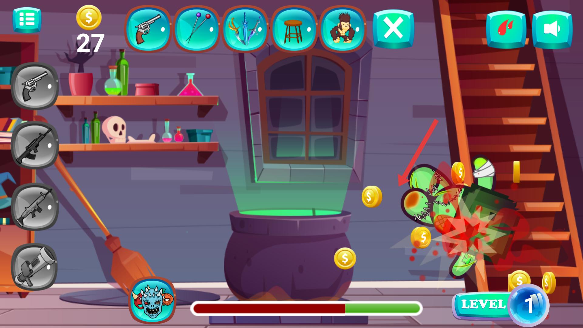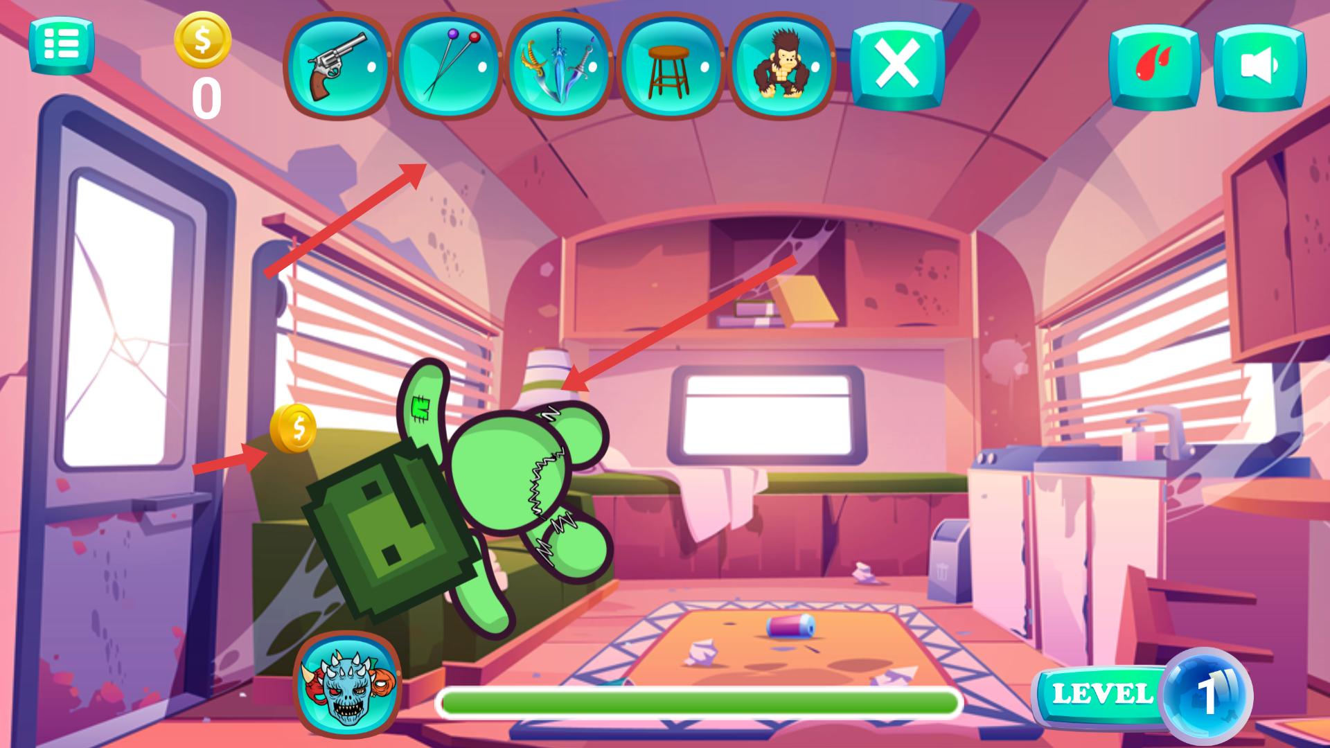 1、利用屏幕上方的道具,如手槍、針等,對綠色玩偶進行操作,同時注意收集場景中的金幣,積累游戲資源。