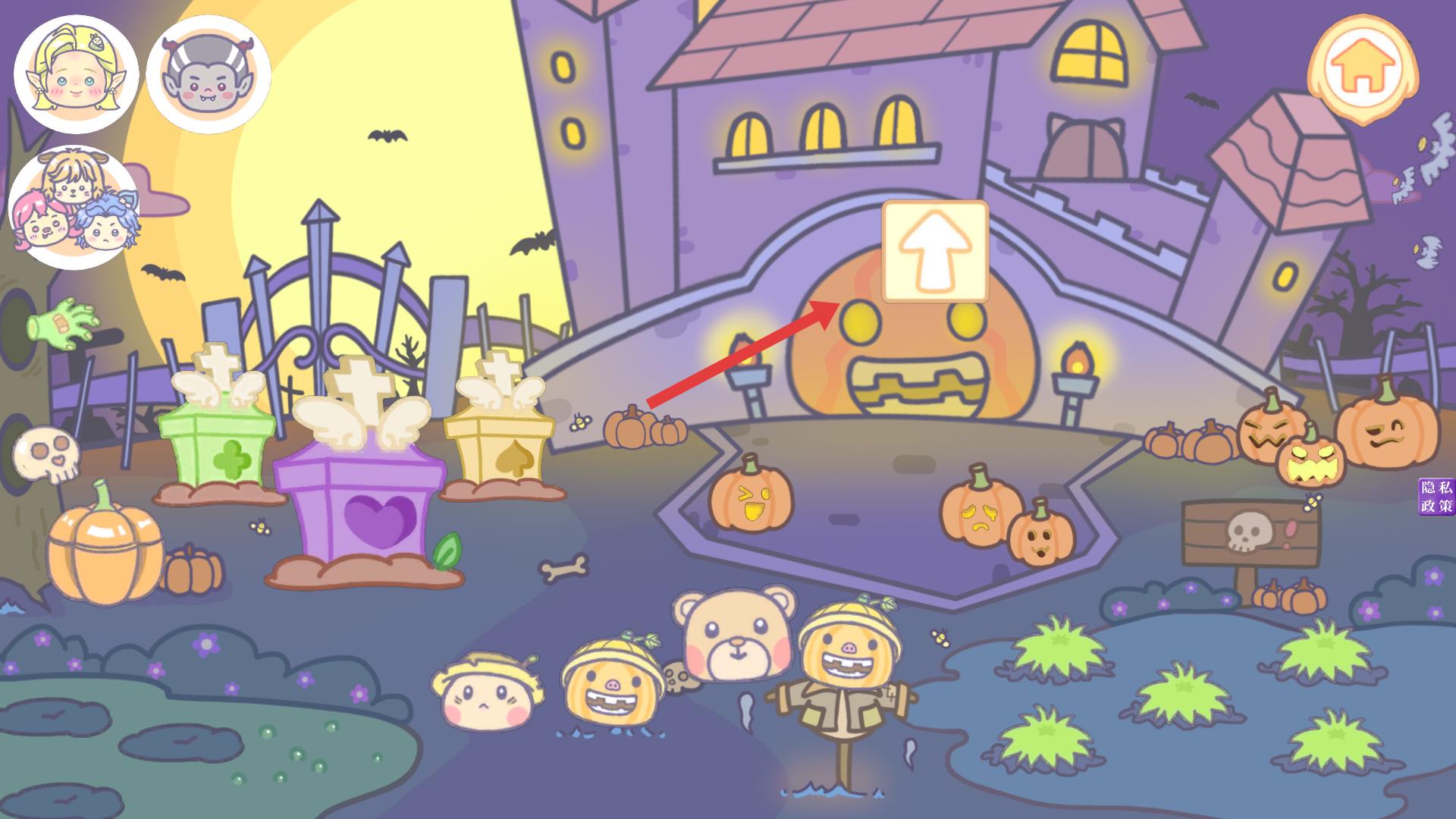 1、點擊帶有箭頭標識的南瓜形狀入口,進入到不同的房間,探索房間內的各類元素,開啟游戲互動。