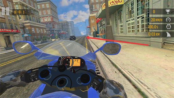 2、以第一視角駕駛摩托在城市街道行駛,右側會顯示速度、時間、行駛距離等數據,留意道路狀況和周圍環境。