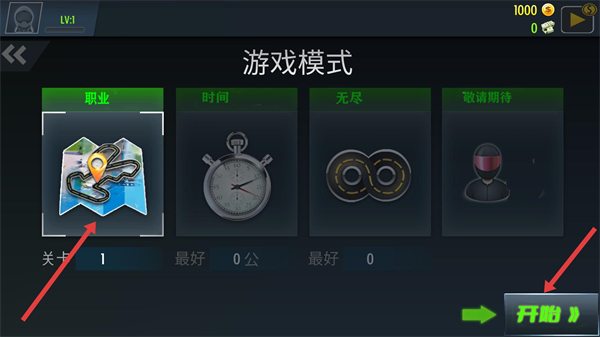 1、選擇職業模式,關卡從1開始,點擊開始按鈕,即可開啟摩托駕駛的關卡挑戰,準備在城市道路上馳騁。