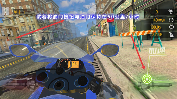 3、駕駛的過程,會有提示試著將油門控制在合適速度,可操作右側加速按鈕來調節摩托速度,讓行駛速度盡量符合要求。