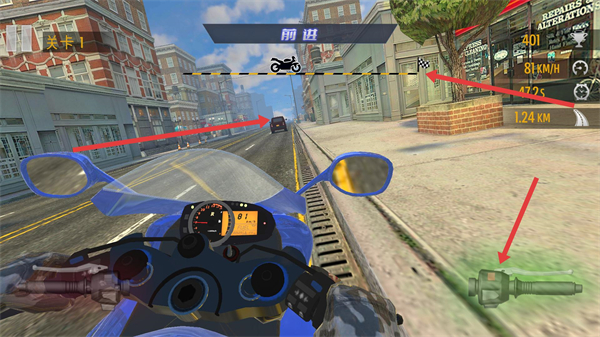4、持續駕駛摩托前進,朝著終點標志行駛,途中注意道路上的車輛等障礙物,通過操作加速按鈕,保持摩托平穩且快速地駛向終點。