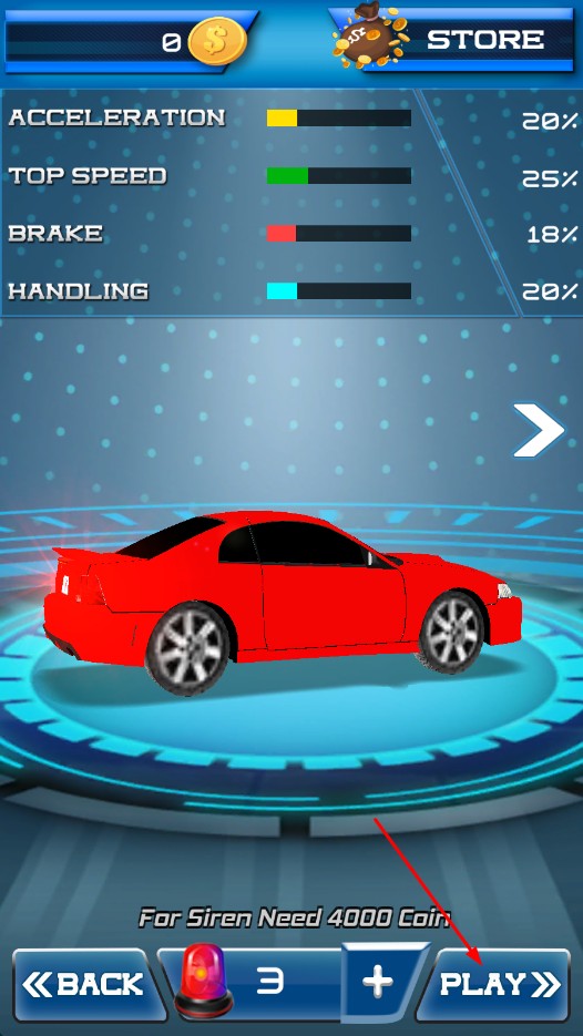 2、在車輛屬性界面,能查看賽車的加速度、最高速度、剎車、操控等屬性,點擊右下角PLAY,可進入賽道開始比賽。