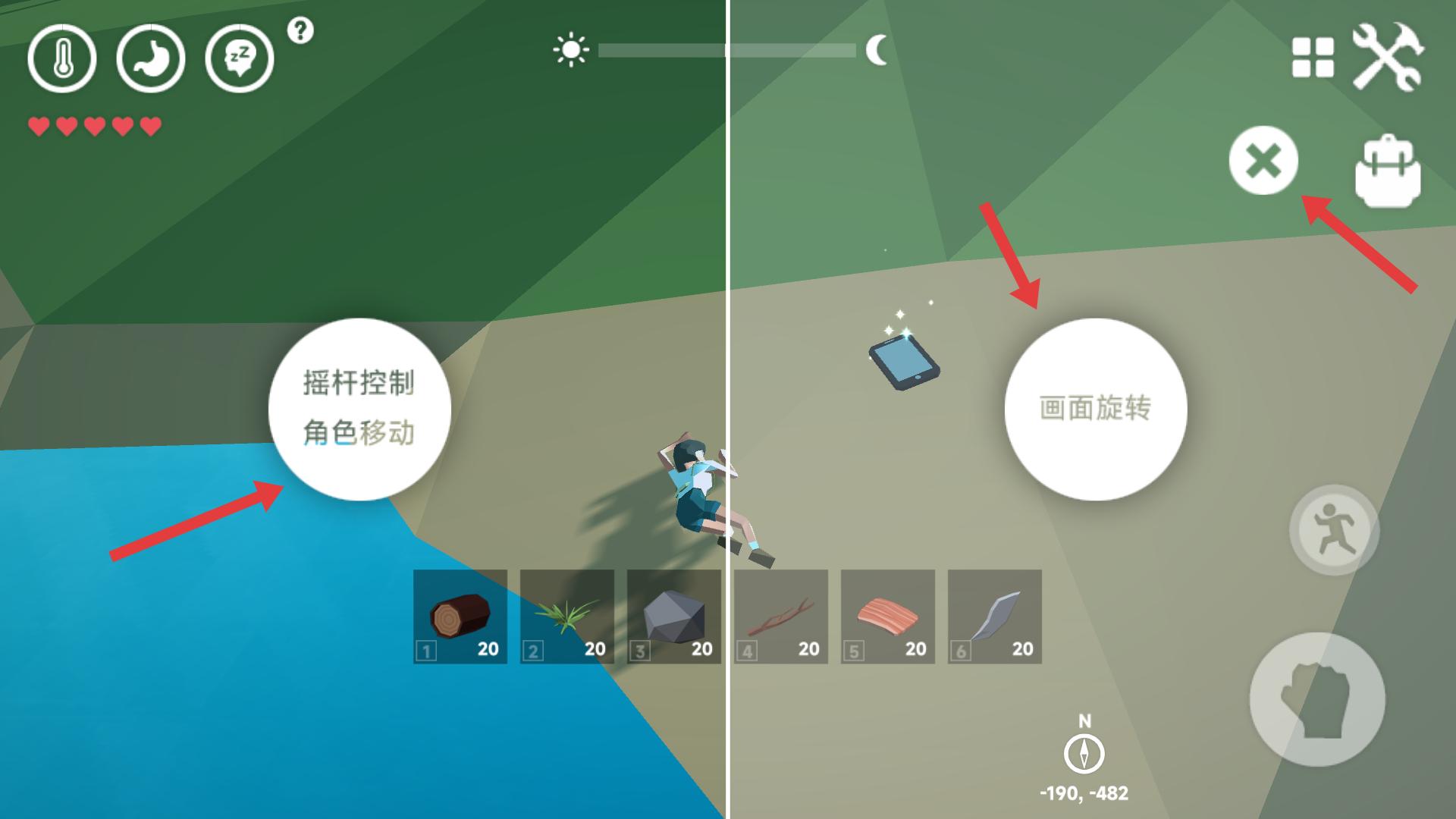 4、進入游戲場景,用搖桿控制角色移動,還能進行畫面旋轉等操作,在島上收集資源,努力生存下去。