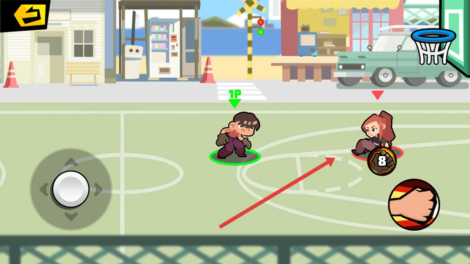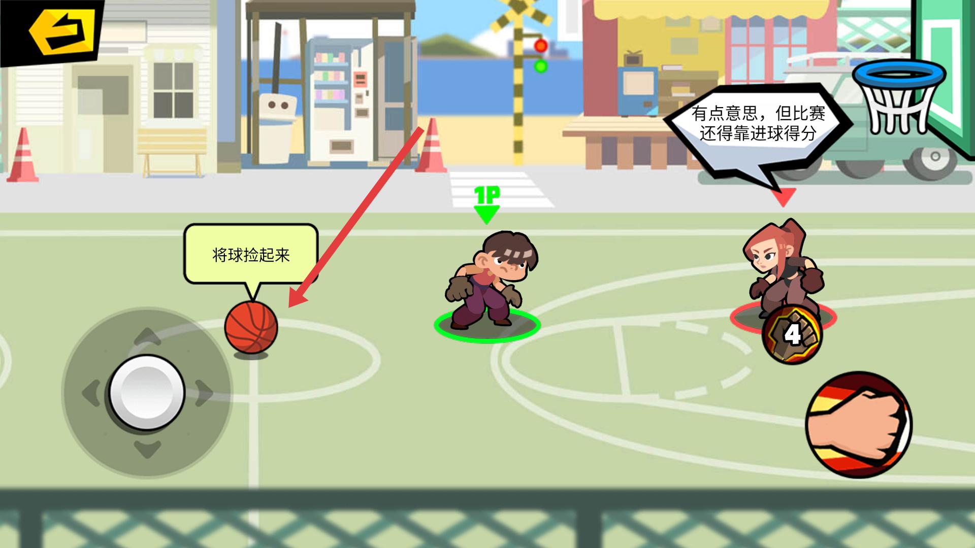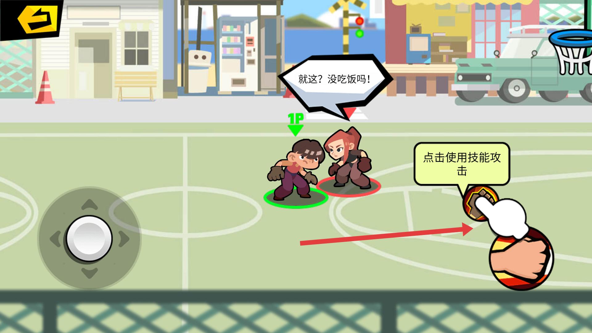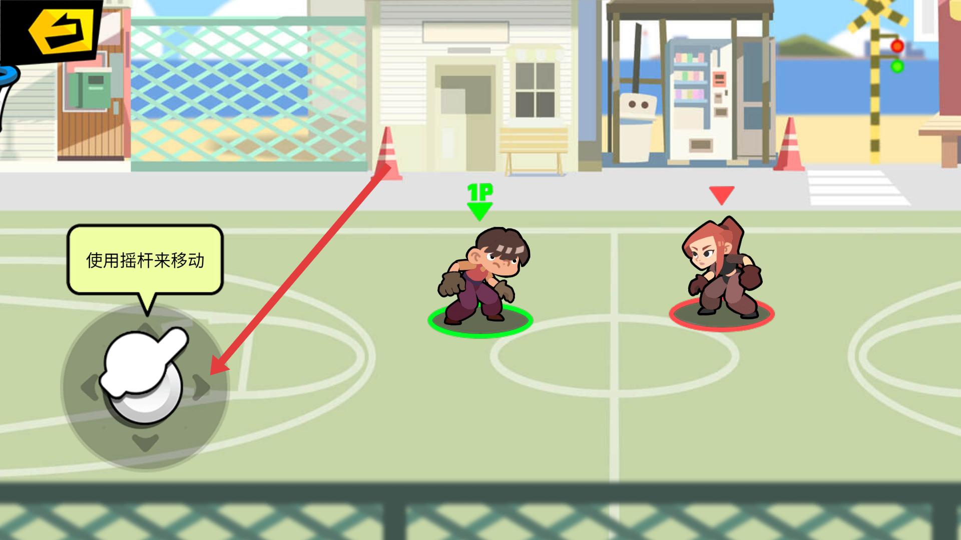 1、打開格斗籃球游戲,進入球場場景,看到使用搖桿來移動的提示,操控搖桿,讓角色在球場上移動,熟悉移動操作,為后續對戰做準備。