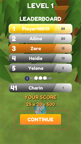 4、比賽結束后會顯示排行榜展示玩家和其他對手的得分及排名情況,點擊CONTINUE按鈕,可以進入下一個關卡。