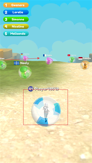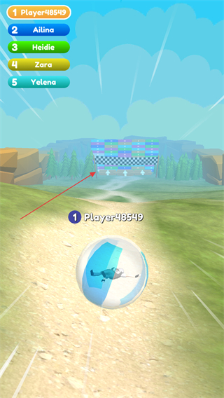 2、在比賽過程中操控角色朝著終點線方向移動,可以通過調整透明球的滾動方向和速度,努力超越其他對手率先到達終點。