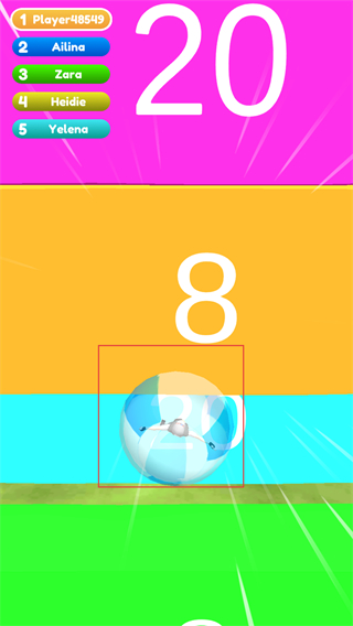 3、賽道上會有不同顏色的得分區域,每個區域標有不同的分數,讓角色的透明球經過這些區域,獲取相應的分數。