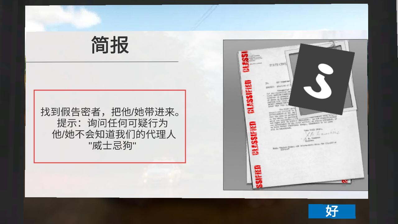 3、會收到簡報任務,要找到假告密者,通過詢問可疑行為等方式,辨別出目標人物并將其帶至指定地點。