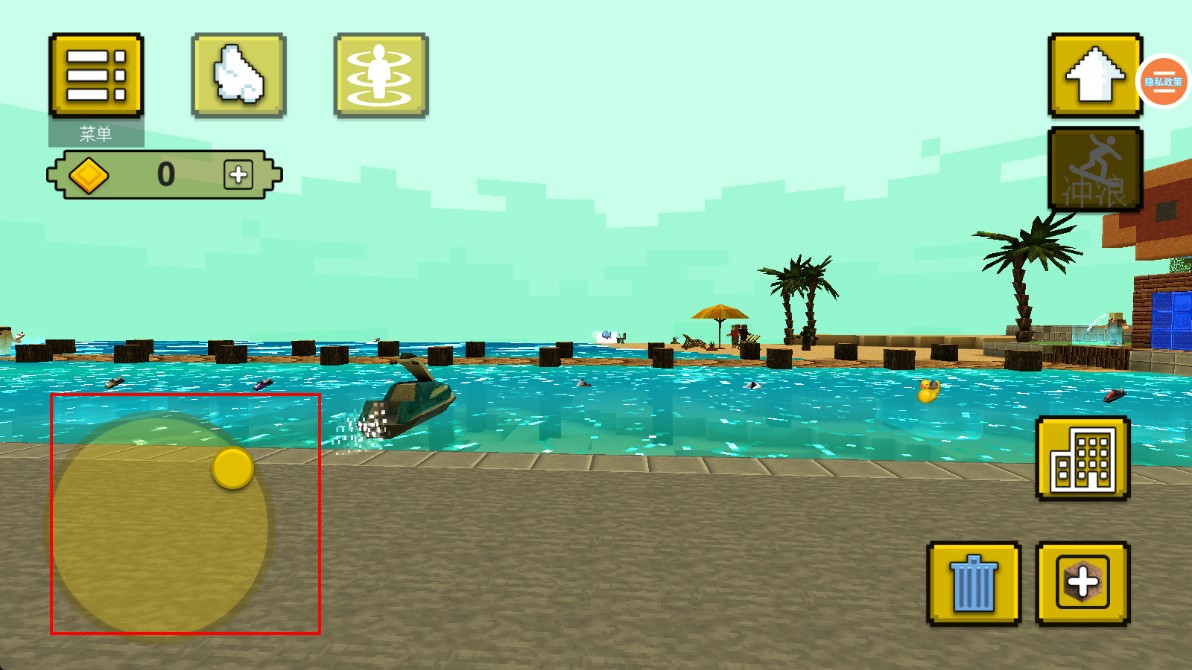 2、通過操控左側虛擬搖桿,能控制角色在海濱及周邊區域移動,自由前往不同地點,為建造做準備。