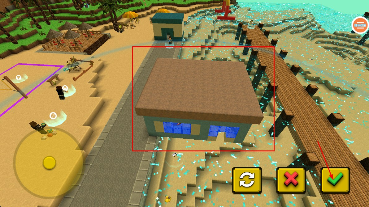 4、完成建筑搭建后,點擊右側對勾按鈕,可確認建造成果,讓建筑固定在場景內,完善海濱區域的布局。