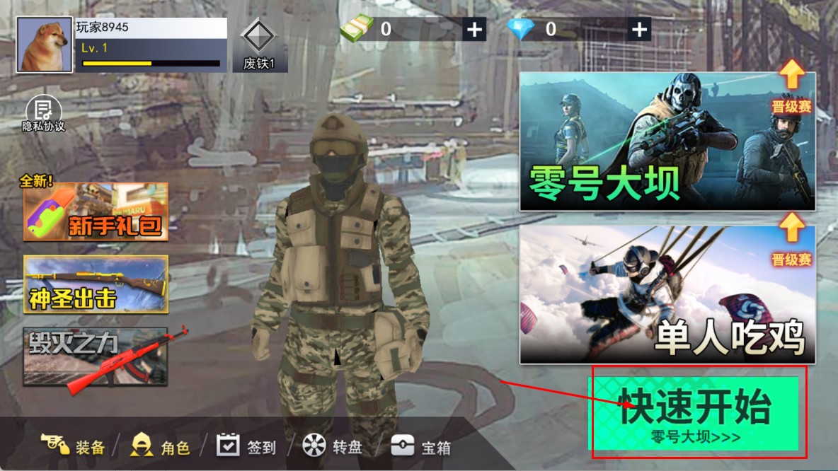 1、點擊快速開始準備進入零號大壩模式可快速開對戰,還可領新手禮包提升戰力。