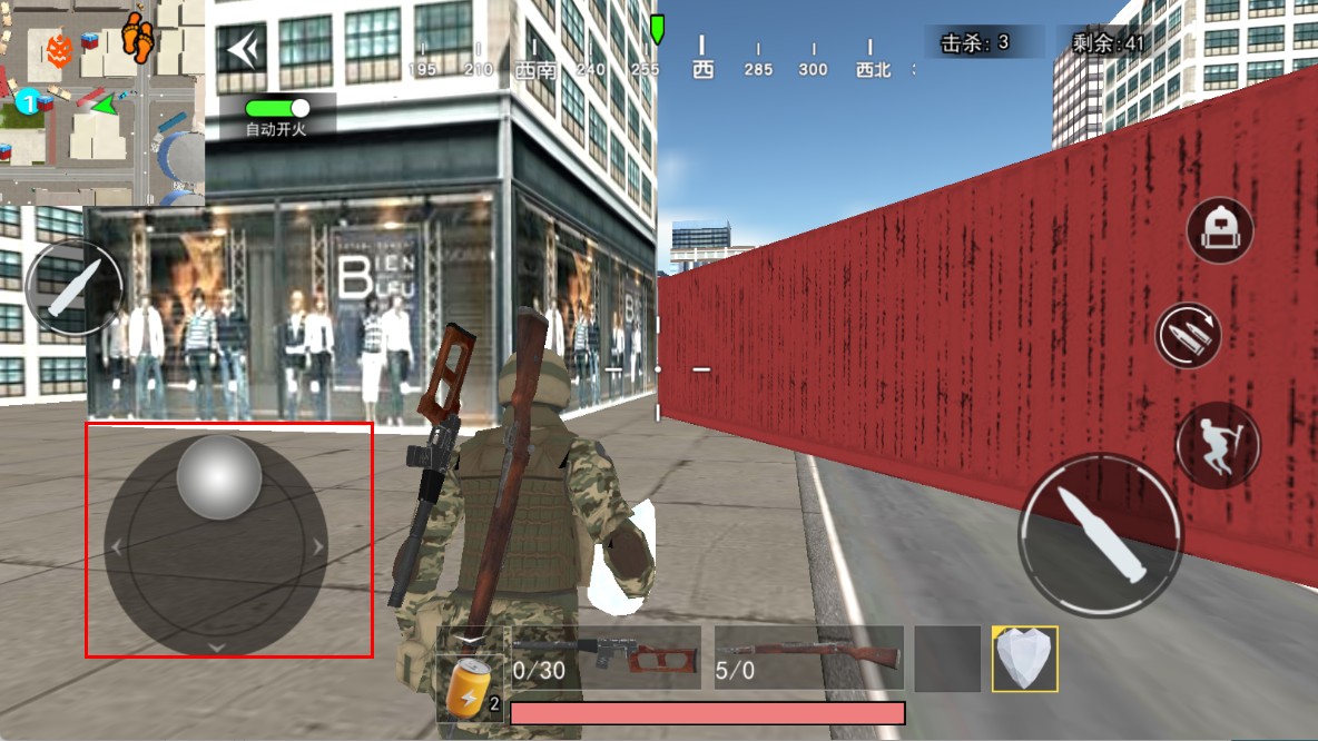 4、通過左側移動搖桿,控制角色移動,調整站位躲避攻擊、尋找敵人,提升擊殺數量。