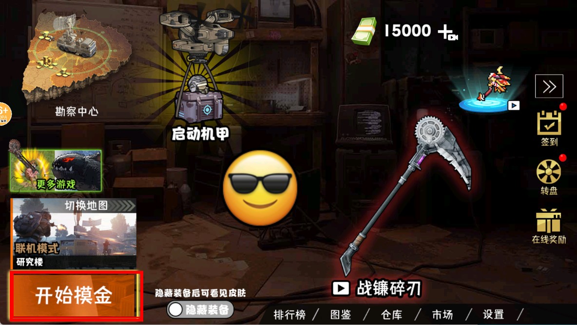 1、進入游戲主界面,能看到“開始摸金”等選項,點擊“開始摸金”按鈕,即可開啟冒險之旅,進入游戲場景。