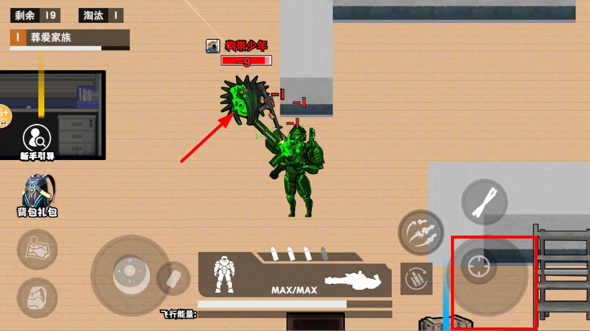 4、在場景中遭遇其他角色時,可利用武器攻擊對方,通過點擊右側攻擊相關按鈕,對敵人造成傷害,淘汰對手,提升自己的排名。