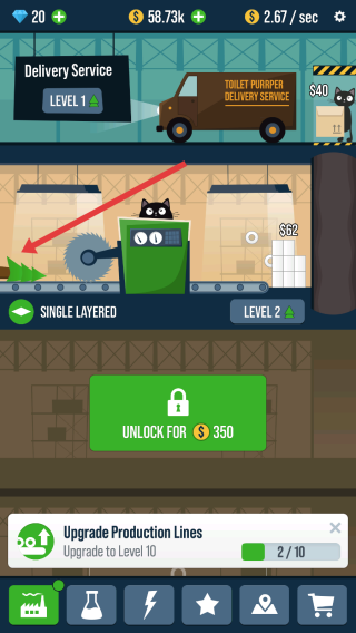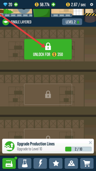 2、界面有帶鎖的區域,標注UNLOCKFOR350,花費對應金額可解鎖新區域,解鎖后可拓展生產或開啟新功能。