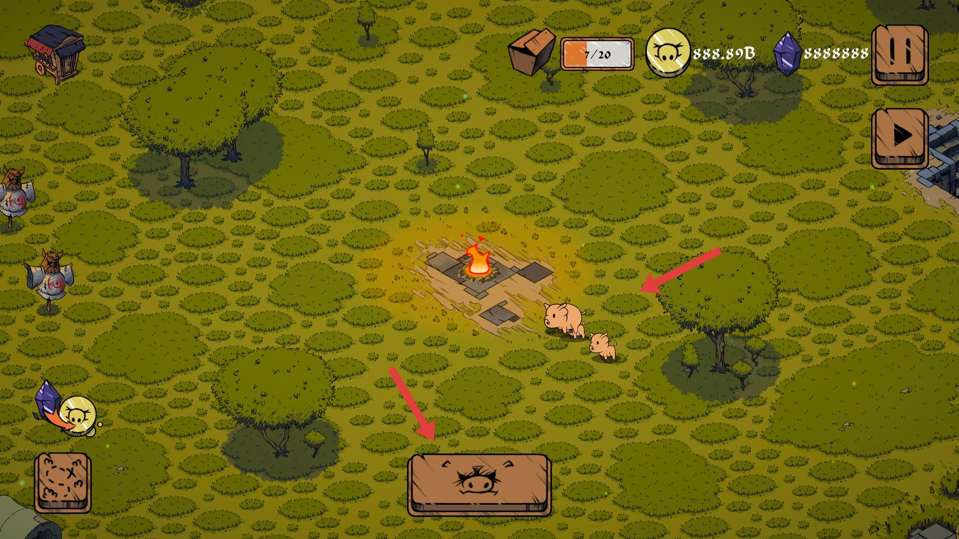 1、進入游戲,能看到野外場景,有篝火,小豬等元素,還有各類資源顯示,開啟冒險與經營之旅。